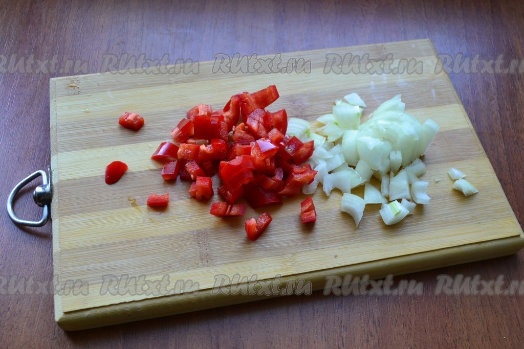Лук и чеснок очистить, удалить семена и плодоножку из болгарского перца. Лук и болгарский перец нарезать небольшими кубиками.