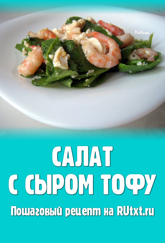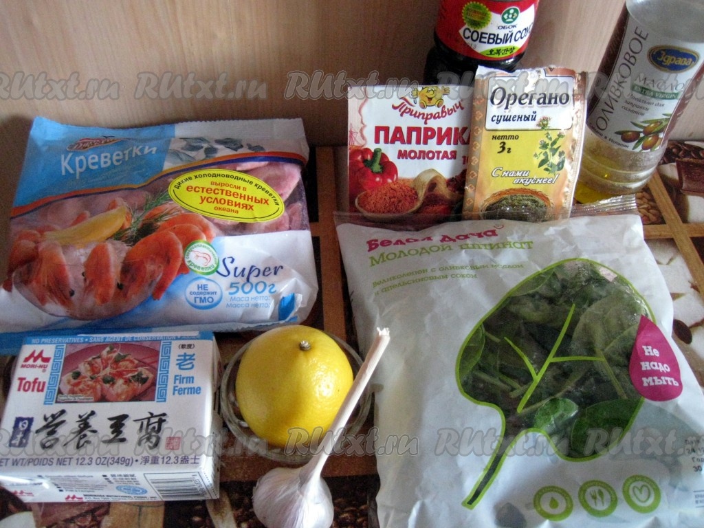 Салат с сыром тофу, креветками и шпинатом - низкокалорийный, но в тоже время сытный и питательный. Тофу (соевый творог) содержит много белка, шпинат - большое количество витаминов и микроэлементов, а креветки - богаты кальцием и йодом. Возможно, салат и на любителя, но я его очень рекомендую попробовать.