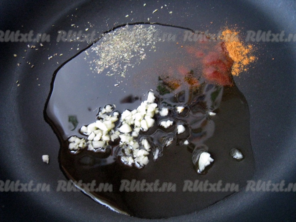 Разогреть на сковороде оливковое масло, добавить в него мелкорубленый чеснок, орегано и паприку.