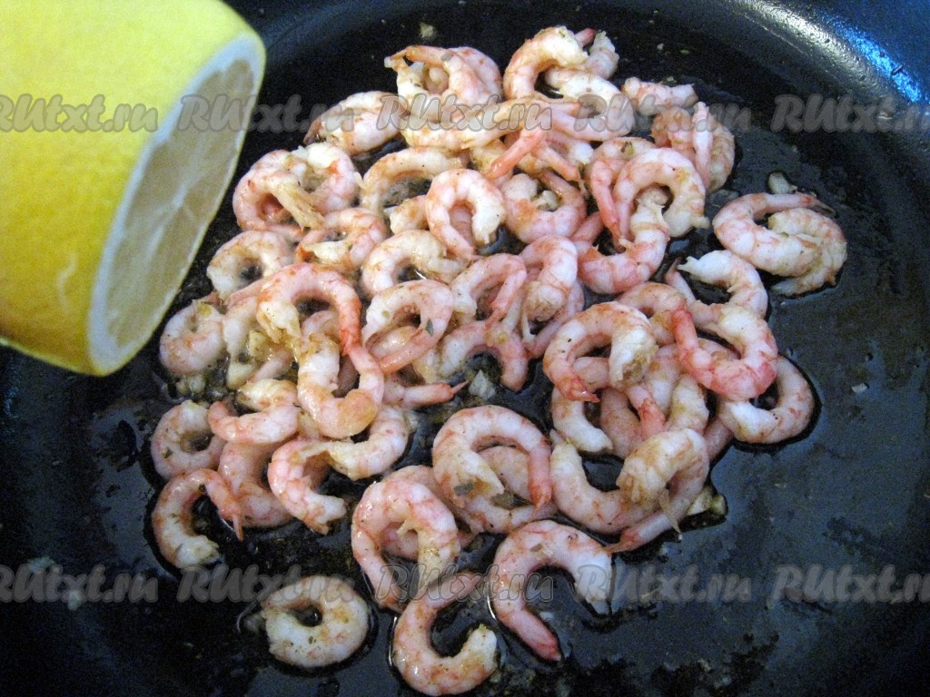 Затем высыпать на сковороду креветки, немного обжарить (2-3 минуты) их на слабом огне и полить лимонным соком.