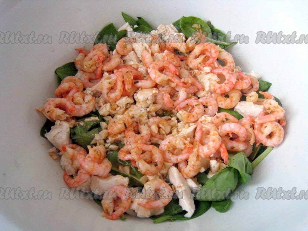 Добавить креветки. Заправкой салата с сыром тофу, креветками и шпинатом будет тот соус, который образовался на сковороде.