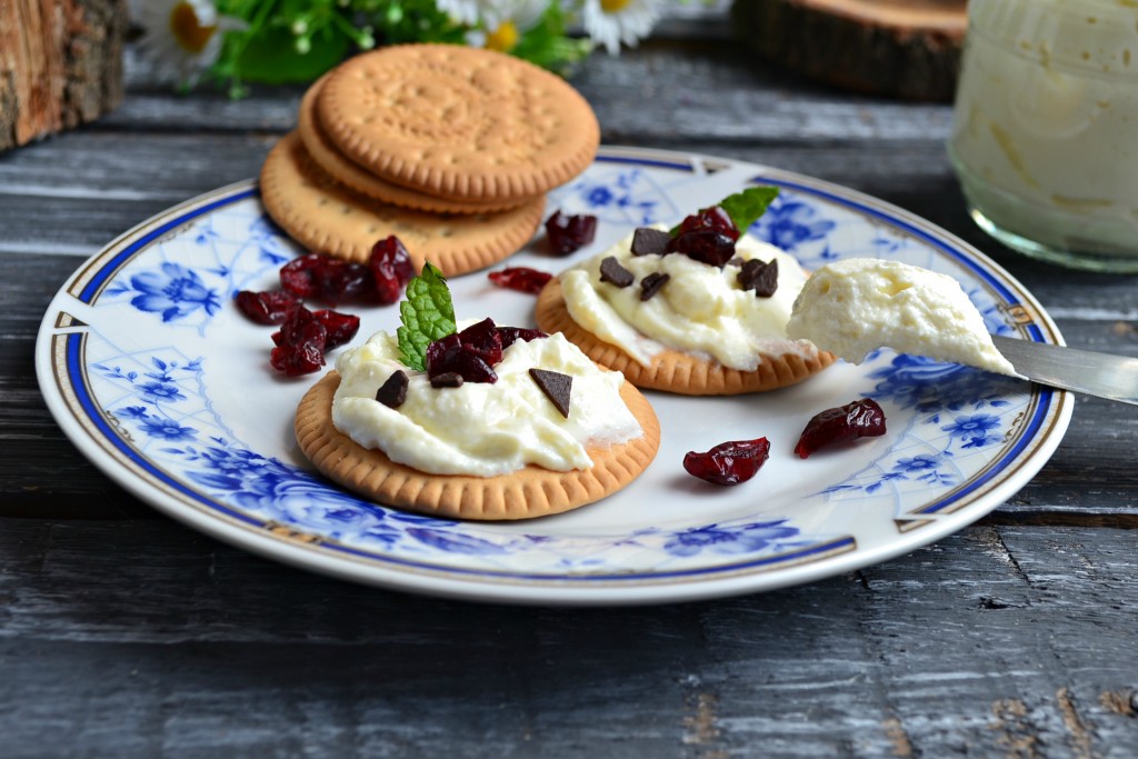 В другом случае - я просто добавила в домашний сыр "Филадельфия" сахар и подала его на сладком печенье с вяленой клюквой.
