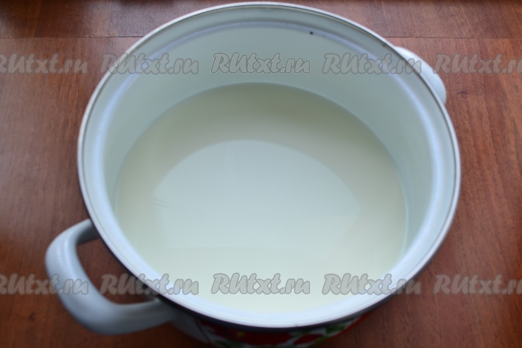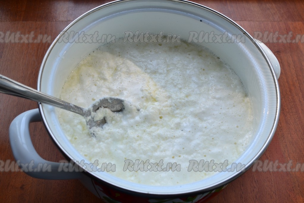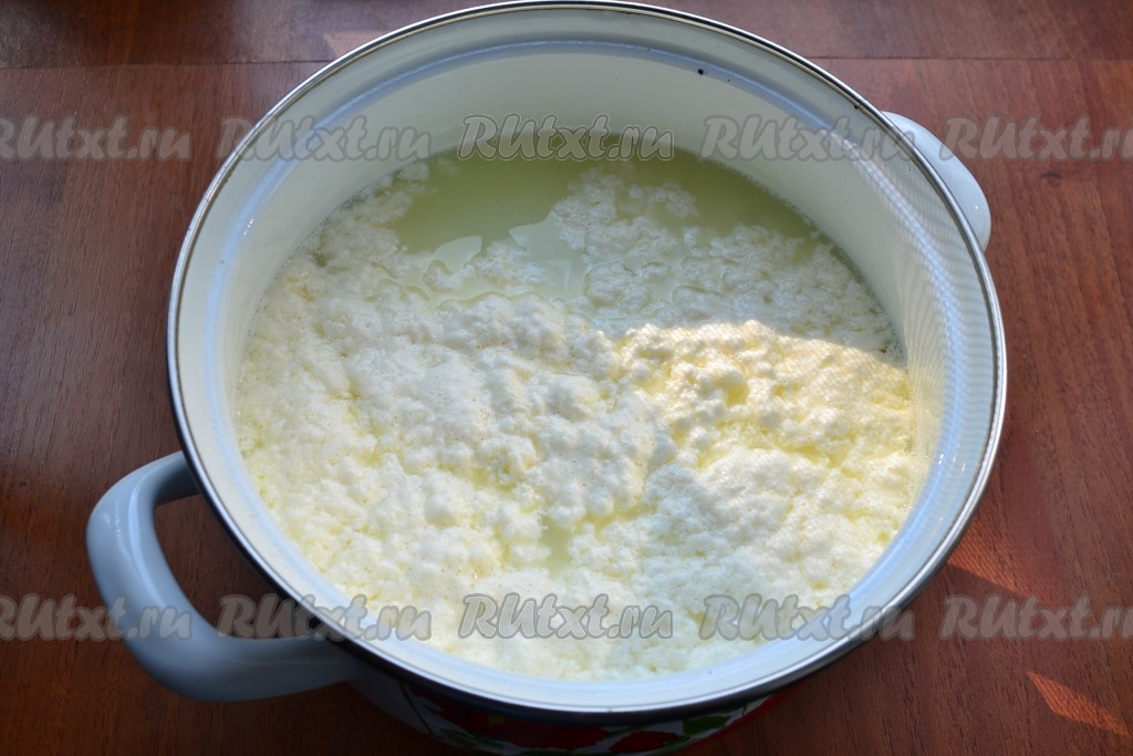 Перемешивать все около 3-4 минут, молоко должно свернуться и творог отделится от сыворотки.