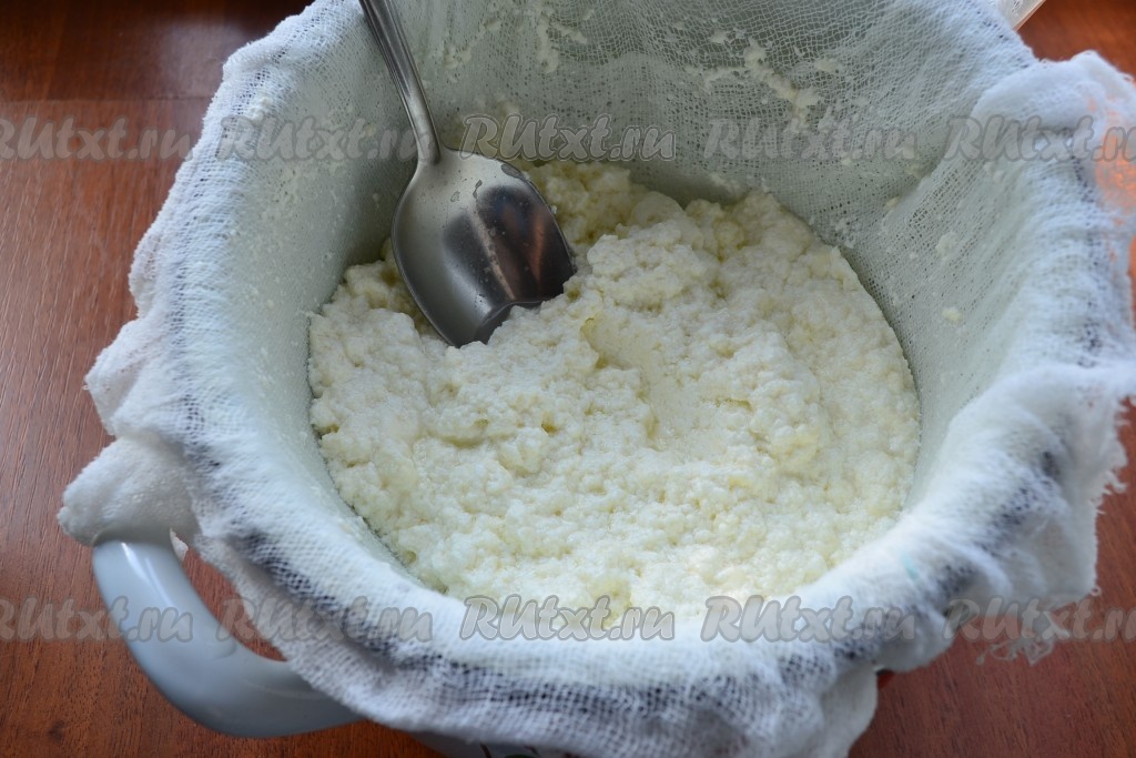 Отцедить горячий творог от сыворотки через 2 слоя марли. Перемешивать творог в марле до тех пор, пока не стечет вся сыворотка.