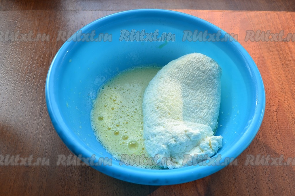 В яичную смесь выложить отцеженный и отжатый мягкий творог.
