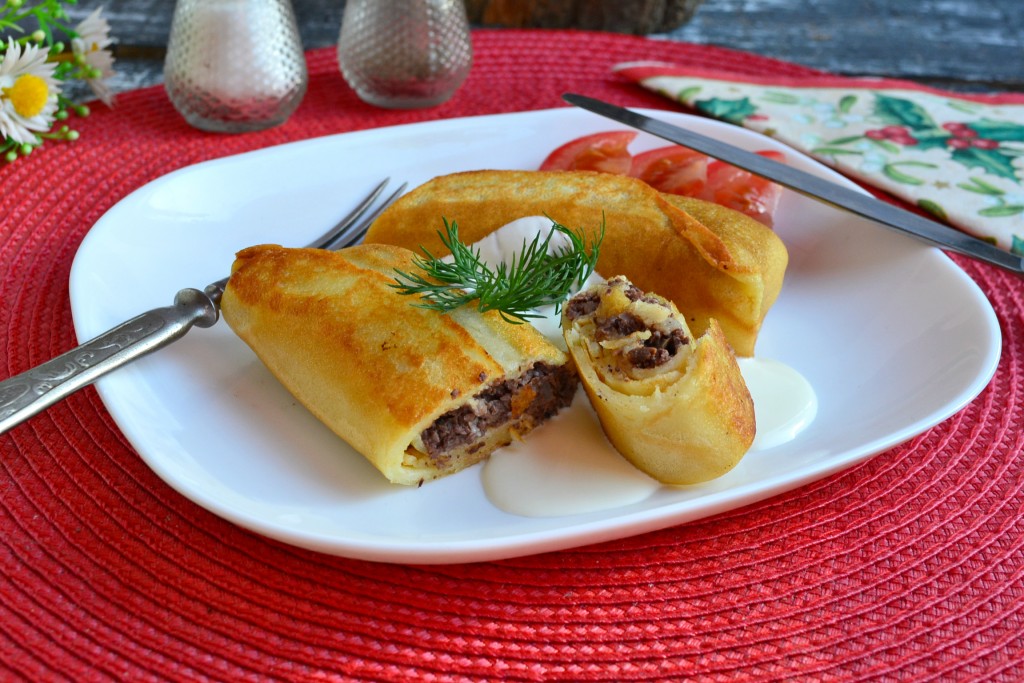 Предлагаю вам приготовить к завтраку блины с ливером. Блины очень вкусные! Я использовала для начинки свиное сердце и легкие, можно добавлять еще почки, печень. Блины можно приготовить заранее и их отлично подать на завтрак со сметаной, поджарив на сковороде. Попробуйте, очень вкусно!