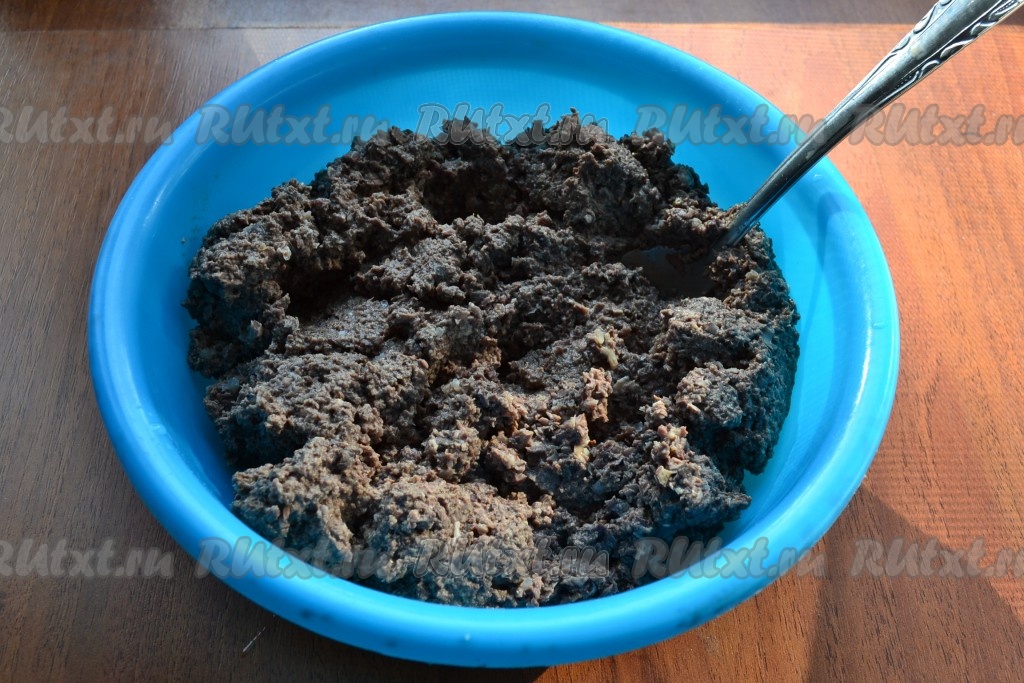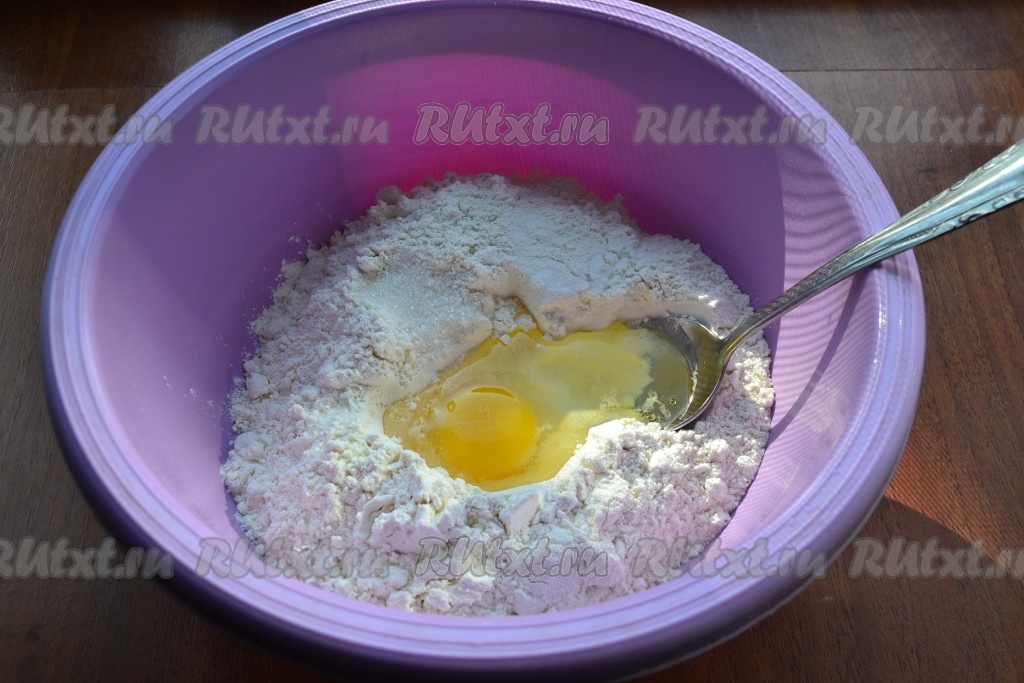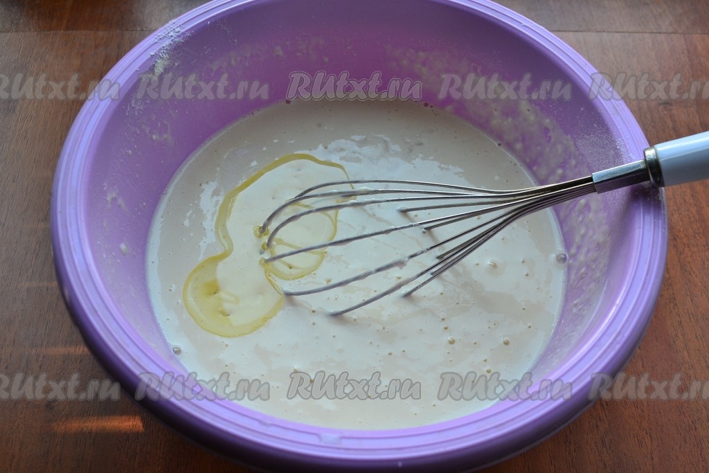 Добавить соду, гашеную уксусом или лимонной кислотой, и влить растительное масло. Все перемешать. Тесто по консистенции получается не слишком жидким.