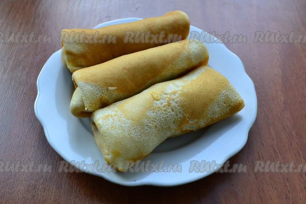 Блины пожарить на чуть смазанной растительным маслом сковороде обычным способом - на среднем огне до румяности с двух сторон. На каждый блин выкладывать по 1-1,5 столовые ложки ливера.