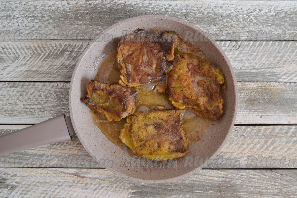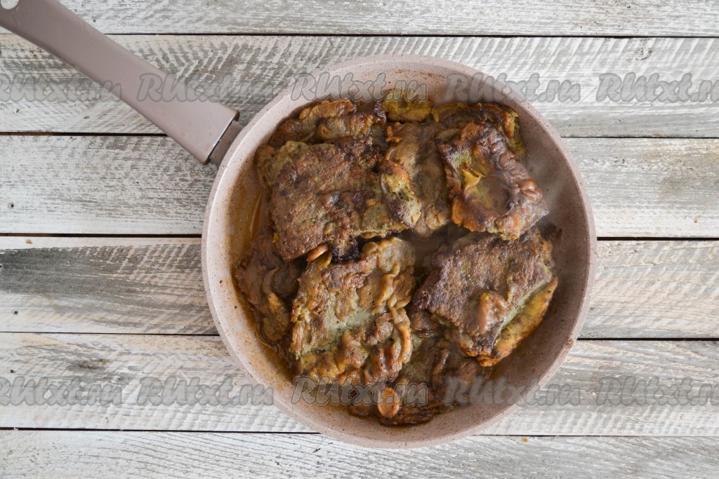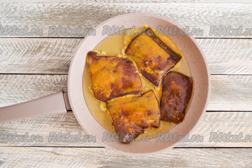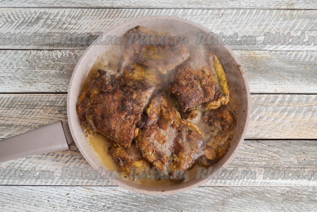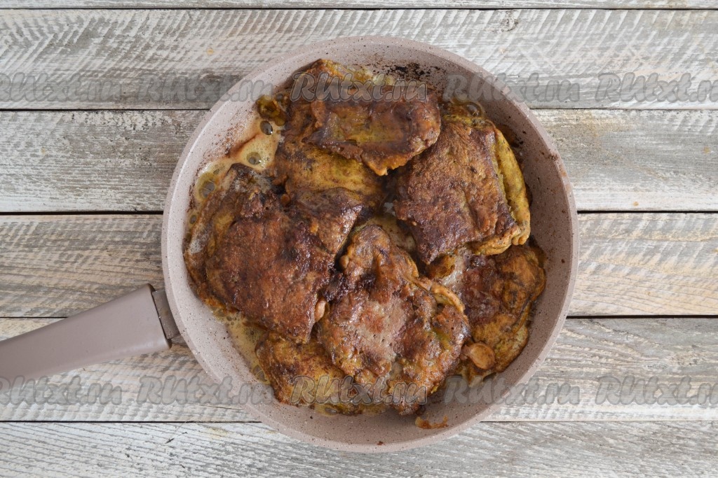 Обжарить накрахмаленную печень на минимальном огне по 3 минуты с каждой стороны (до красивой румяной корочки).