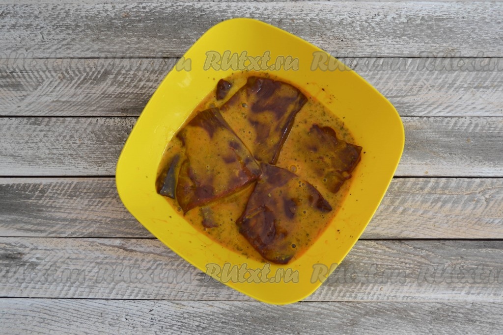 Печень вымыть, удалить пленочку и прожилки. Нарезать печенку средними кусочками (толщиной, примерно, 1 см). Для удобства нарезания можете положить печень на 30 минут в морозильную камеру.