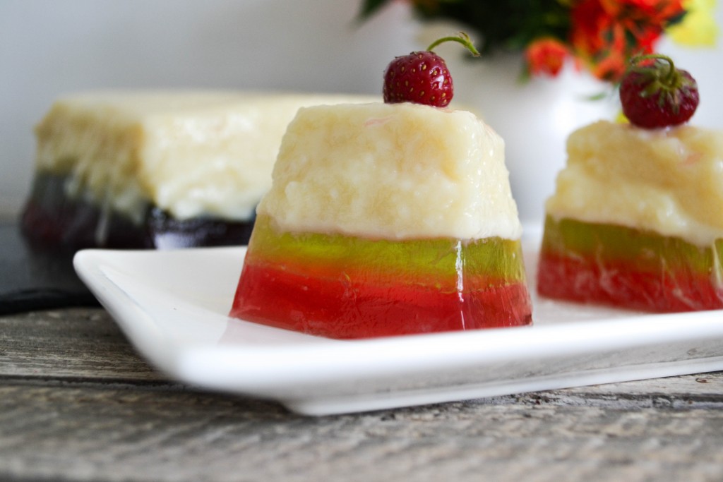 Вылить в форму клубничное желе, когда полностью застынет второй слой (со вкусом киви). И снова отправить в холодильник.
