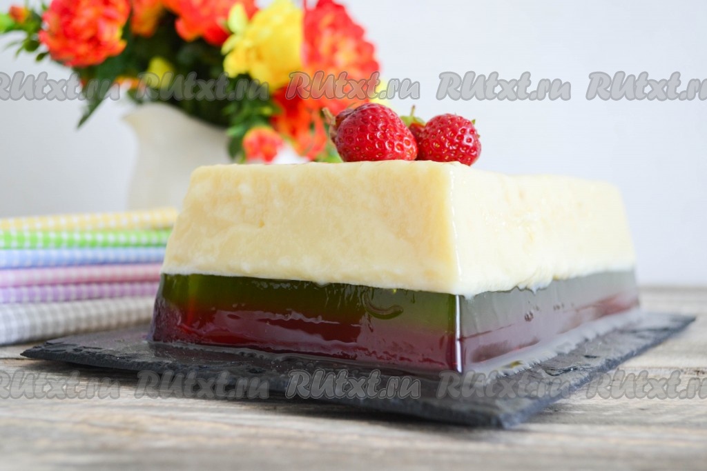 Иногда совсем не хочется включать духовку, а вот чего-то освежающего и холодненького хочется больше обычного. Предлагаю рецепт приготовления замечательного многослойного желе. Пакетики с желе можно выбрать на свой вкус, я готовила с клубничным желе, желе со вкусом киви, а в качестве первого слоя взяла сгущенное молоко с желатином. Количество слоев можно увеличивать, тогда десерт будет еще более красивым. Я вас уверяю, такое блюдо оценят все сладкоежки.
