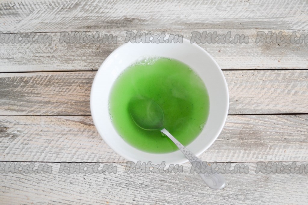 Для подготовки следующего слоя в миску всыпать один пакетик желе со вкусом киви и залить 300 мл кипятка, перемешать до однородности.