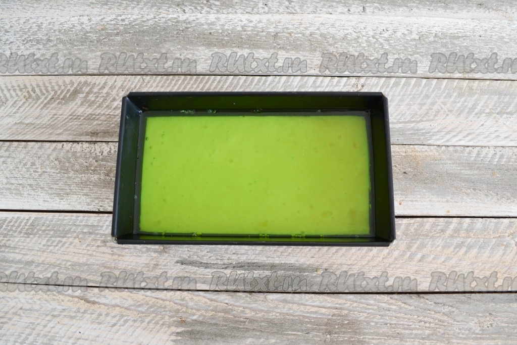 Когда желе из сгущенки застынет, вылить поверх него подготовленное желе со вкусом киви и снова отправить в холодильник.