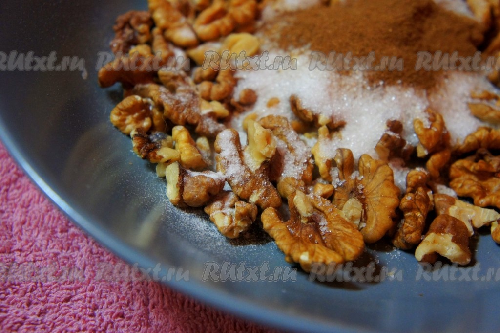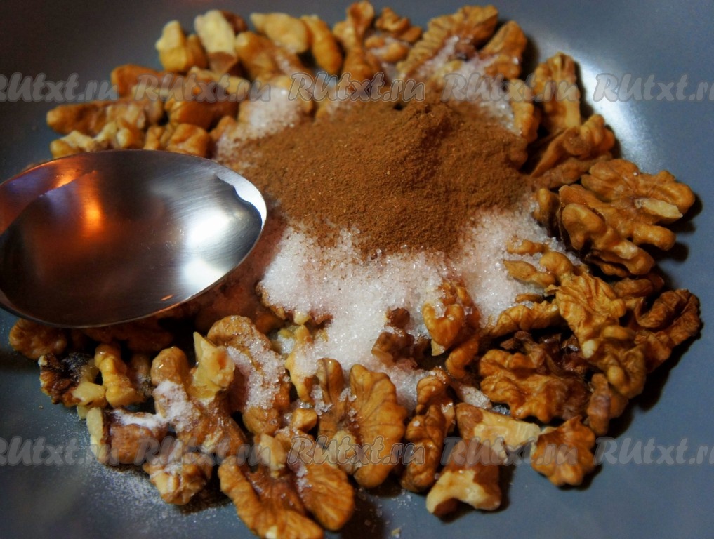Добавить к грецким орехам сахарный песок, корицу, ванилин.