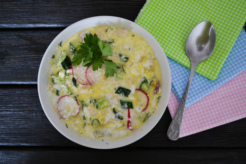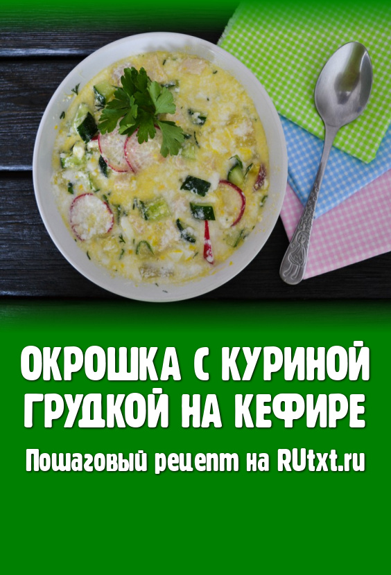 Освежающую, вкусную и очень аппетитную окрошку на кефире с куриной грудкой подать к столу.