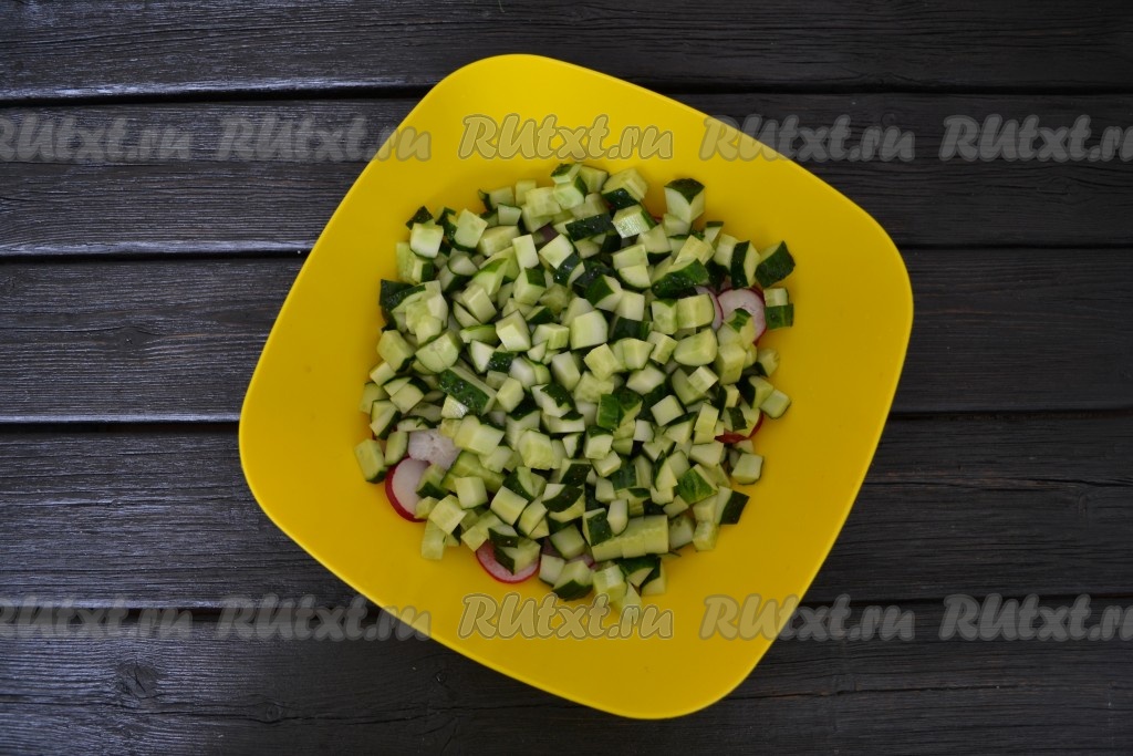 Огурец нарезать мелкими кубиками и соединить в глубокой миске с редисом.