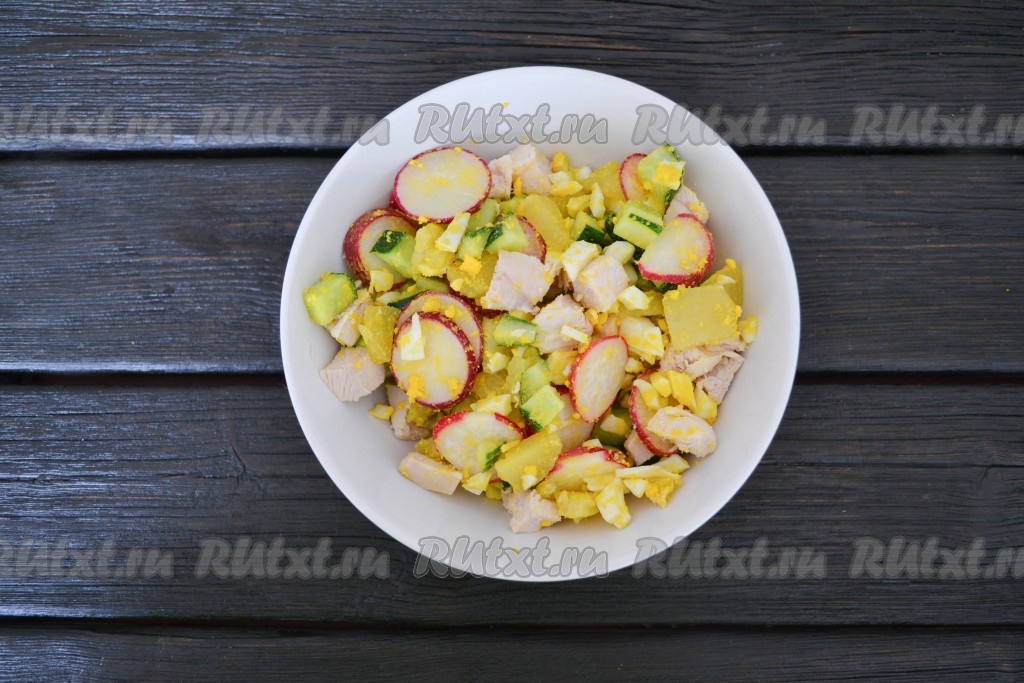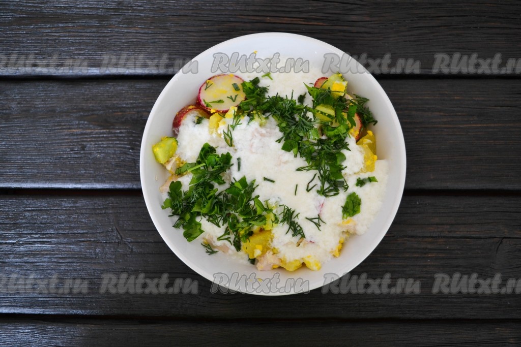 Вкрутую отварить яйца, остудить, очистить от скорлупы, нарезать кубиками и добавить к редиске с огурцами.