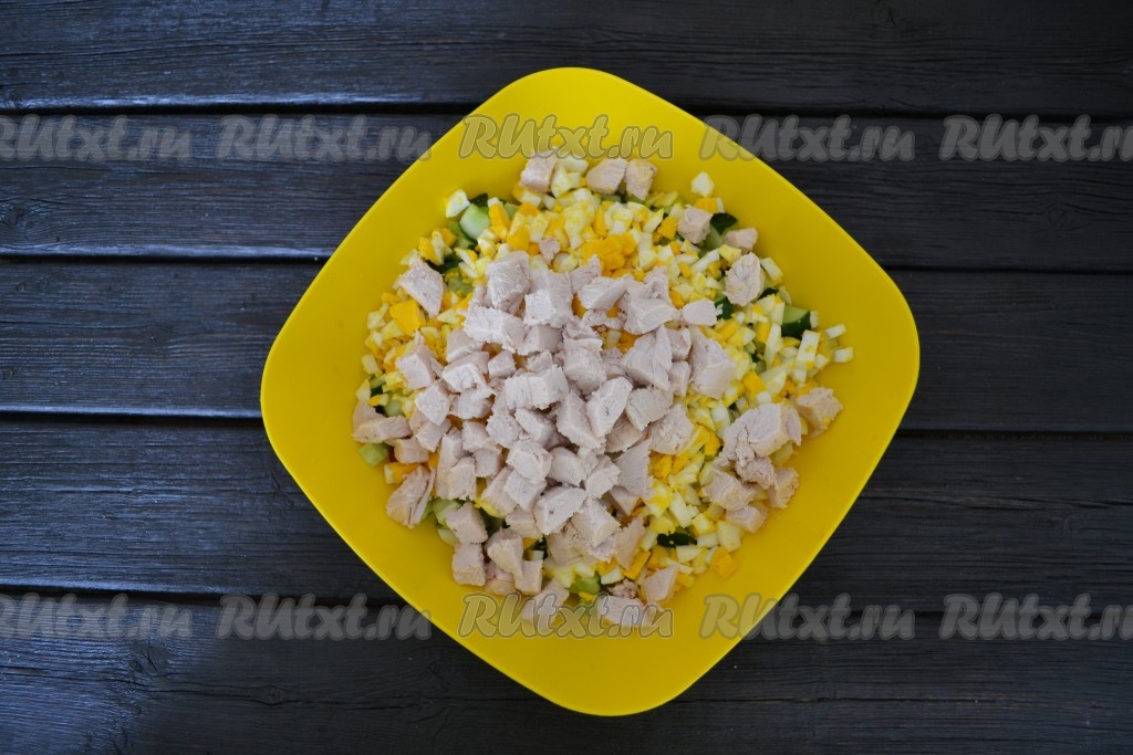 Куриную грудку зачистить от пленок и жира, залить холодной водой, отправить на огонь. Во время закипания снять образовавшуюся пену, по вкусу добавить соль. Варить грудку 30 минут при слабом кипении. Остывшее мясо нарезать небольшими кубиками и соединить с другими нарезанными ингредиентами.