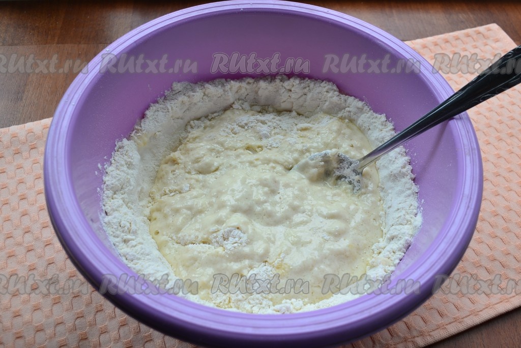 Постепенно вливая смесь масла и сыворотки в смесь муки и дрожжей, замесить тесто.