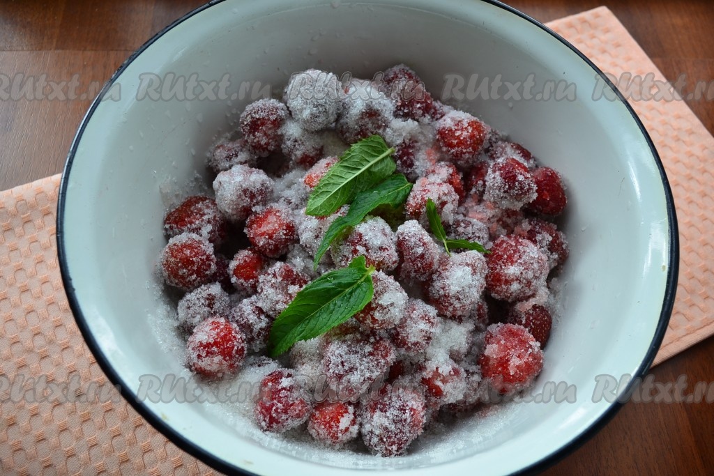 В ягоды всыпать сахар и поместить, по желанию, несколько листиков или веточку мяты. Поставить миску с клубникой на небольшой огонь.