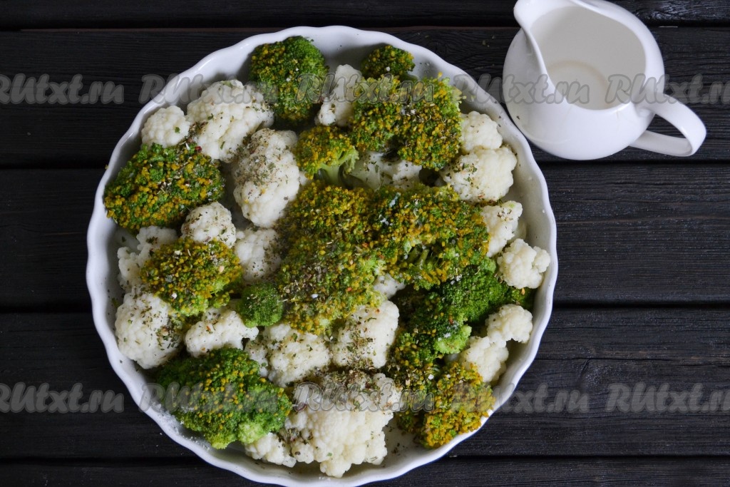 Сверху цветную капусту и брокколи приправить прованскими травами и солью.