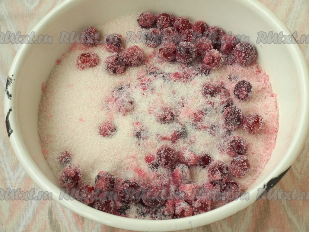 Вишню поместить в эмалированную миску, которую впоследствии будете ставить на огонь. Добавить к вишне сахар и оставить на 6 часов, чтобы вишня пустила сок.