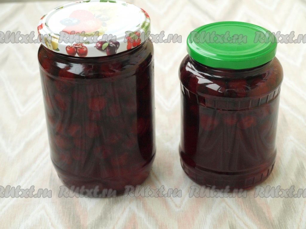 Вишню в желе разлить в сухие стерильные банки и закрутить прокипяченными крышки. Перевернуть банки дном вверх и укутать чем-нибудь тёплым. Оставить до полного остывания, затем убрать баночки на хранение в прохладное место. В горячем состоянии вишня в желе имеет жидкую консистенцию, но по мере остывания она загустеет.