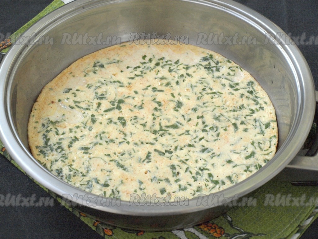 Жарить омлет 4 минуты на среднем огне, не накрывая сковороду крышкой, затем накрыть крышкой, убавить огонь и готовить ещё 3 минуты.