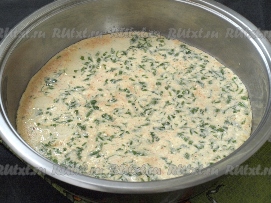 Налить к яйцам молоко. Петрушку мелко нарезать и также добавить в яичную смесь. Ещё раз размешать.