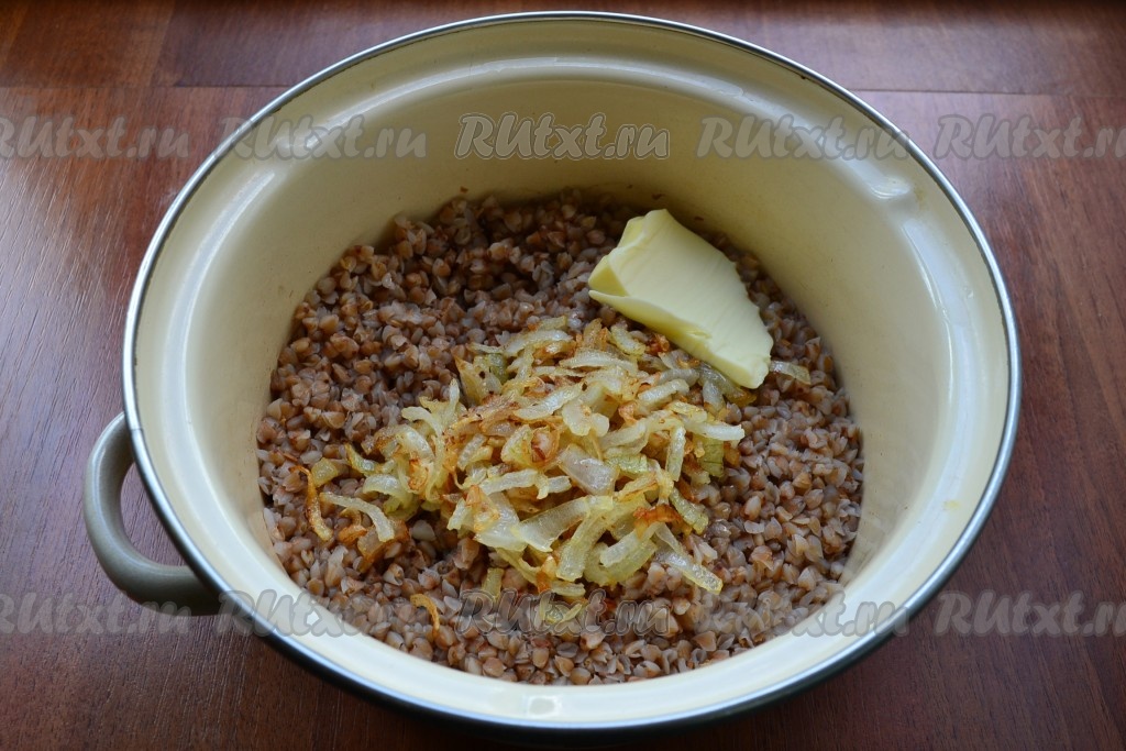 Жареный лук выложить в готовую гречневую кашу, добавить оставшееся сливочное масло.