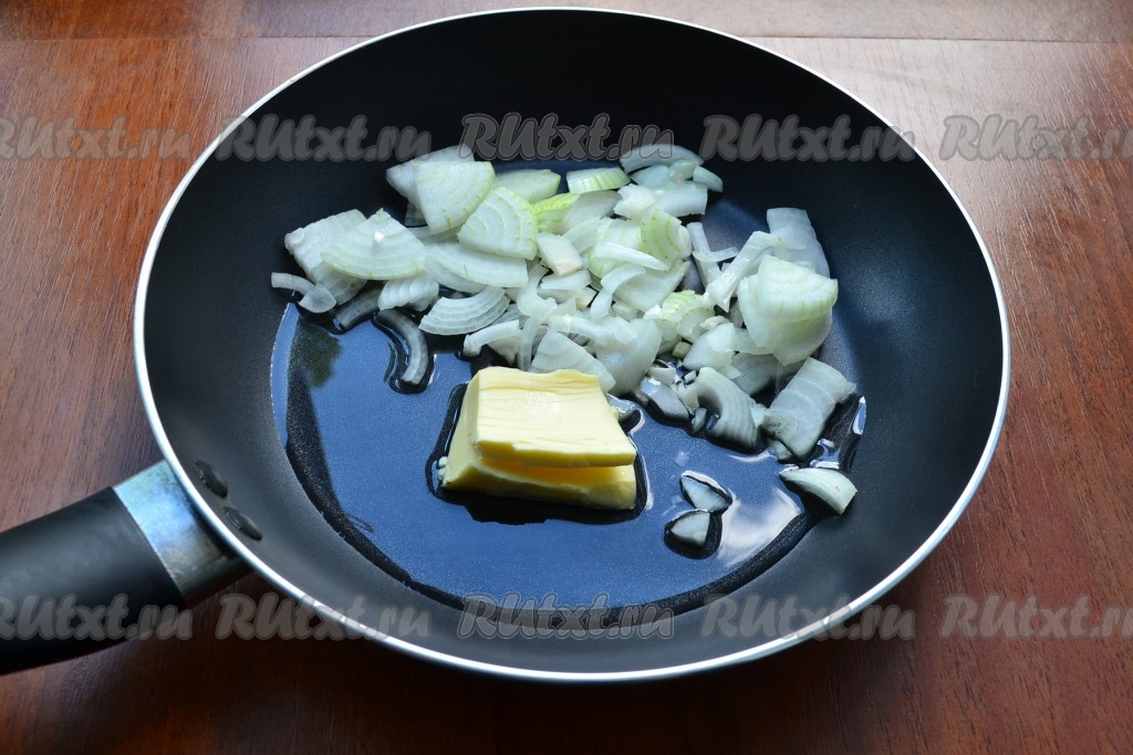 Репчатый лук нарезать тонкими полукольцами или четвертинами, поместить в сковороду с растительным маслом, добавить половину сливочного масла.