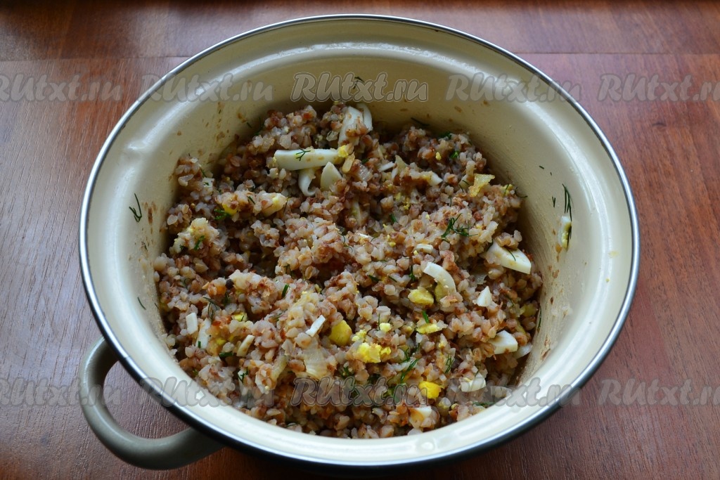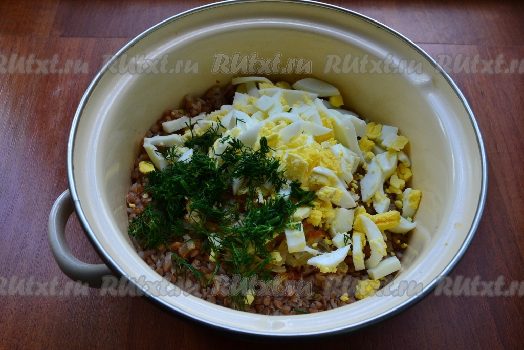 Очищенные вареные яйца нарезать довольно крупно и добавить их в гречку вместе с измельченной зеленью.