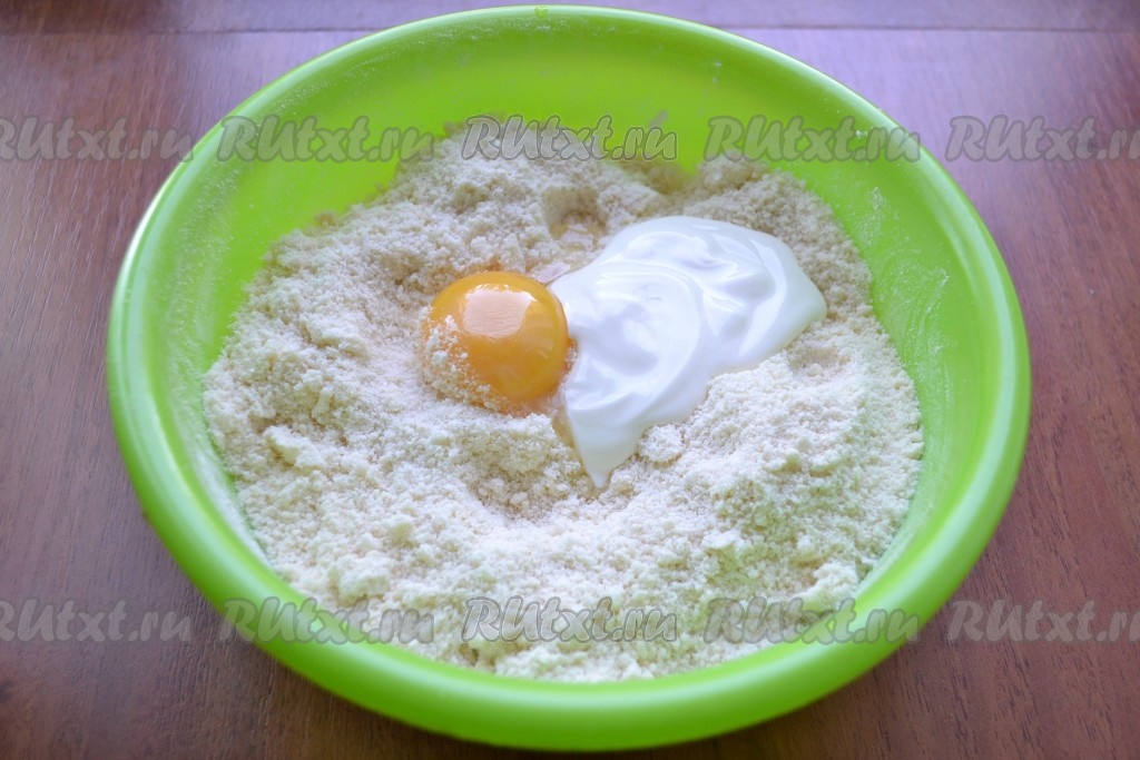 Все перетереть руками в мелкую крошку. Добавить сырой желток и сметану.
