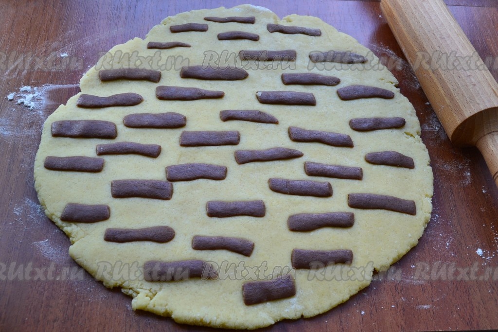 Светлое тесто раскатать, припылив стол мукой, в лепешку толщиной около 1 см. Отщипывая от тёмного теста небольшие кусочки, раскатывать их в тоненькие жгутики длиной около 3-4 см. Эти жгутики выложить на лепешку, чтобы получились полосочки.