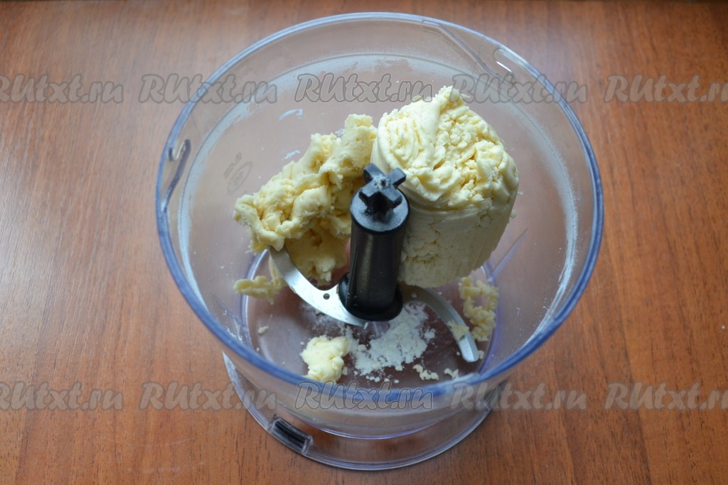 Прежде всего замесим песочное тесто для галеты, я расскажу и о том, как его замесить с помощью блендера, и о том, как замесить его вручную. Если замешивать тесто с помощью блендера, тогда нужно в чашу блендера поместить холодное сливочное масло (из холодильника), нарезанное на кубики, всыпать сахар и муку.