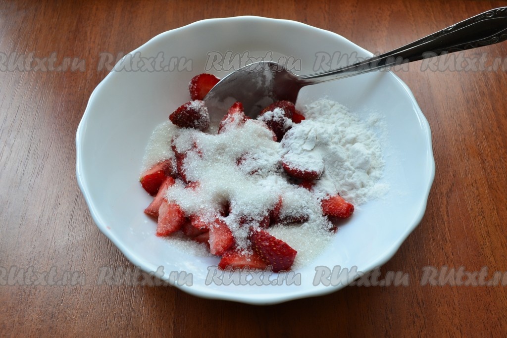 Клубнику вымыть, удалить листочки, обсушить, нарезать на 4 части, переложить в тарелку, всыпать сахар и крахмал, аккуратно перемешать.