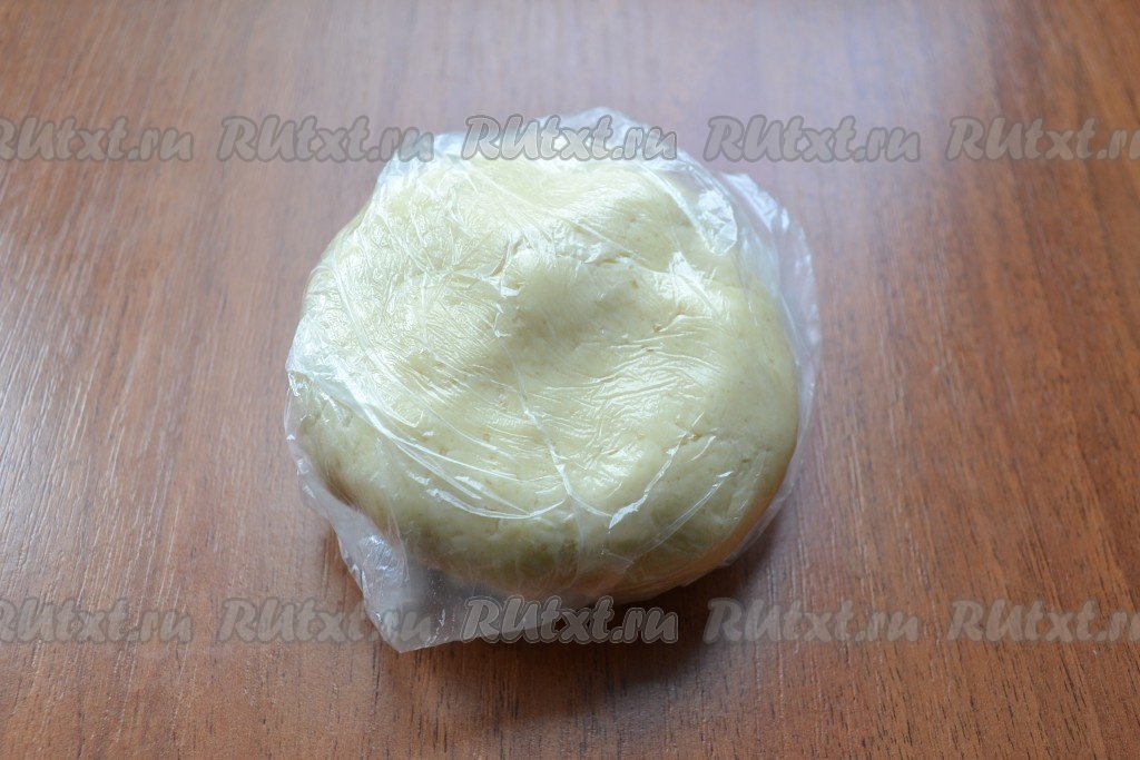 Тесто получится плотным, но нежным и мягким. Тесто и вручную замешивается и быстро, и просто, для этого в миске нужно соединить кусочки холодного сливочного масла, сахар, муку и соль, перетереть руками до получения мелкой, однородной крошки, затем влить ледяную воду и быстро перемешать, собирая тесто в в плотный, но нежный ком. Если тесто будет сильно липнуть к рукам, добавьте немного муки, если же тесто собираться в ком не будет, тогда постепенно влейте 1-2 столовых ложки холодной воды, тщательно вмешивая. Как только песочное тесто соберётся в ком, больше вымешивать его не нужно. Песочное тесто поместить в целлофановый пакет и отправить в холодильник на 1 час.