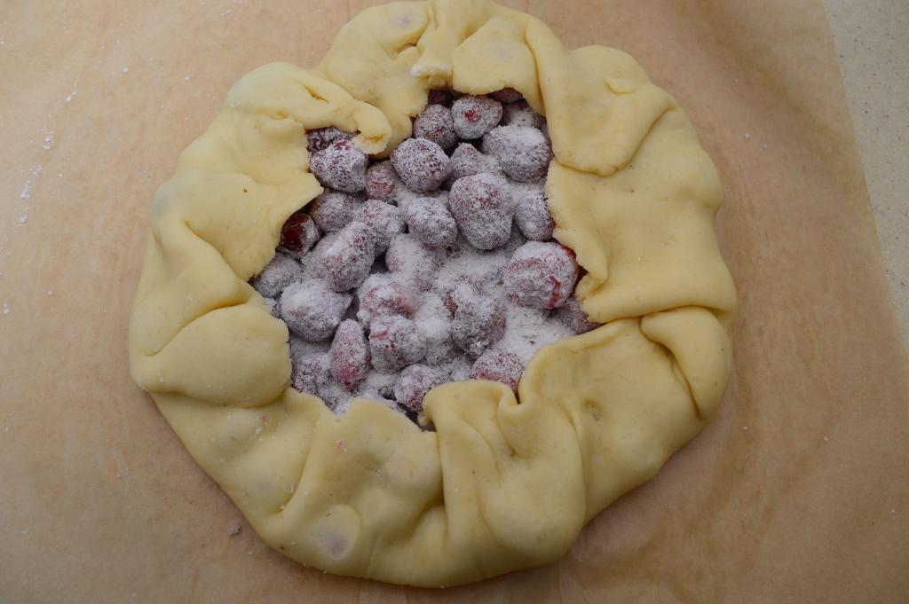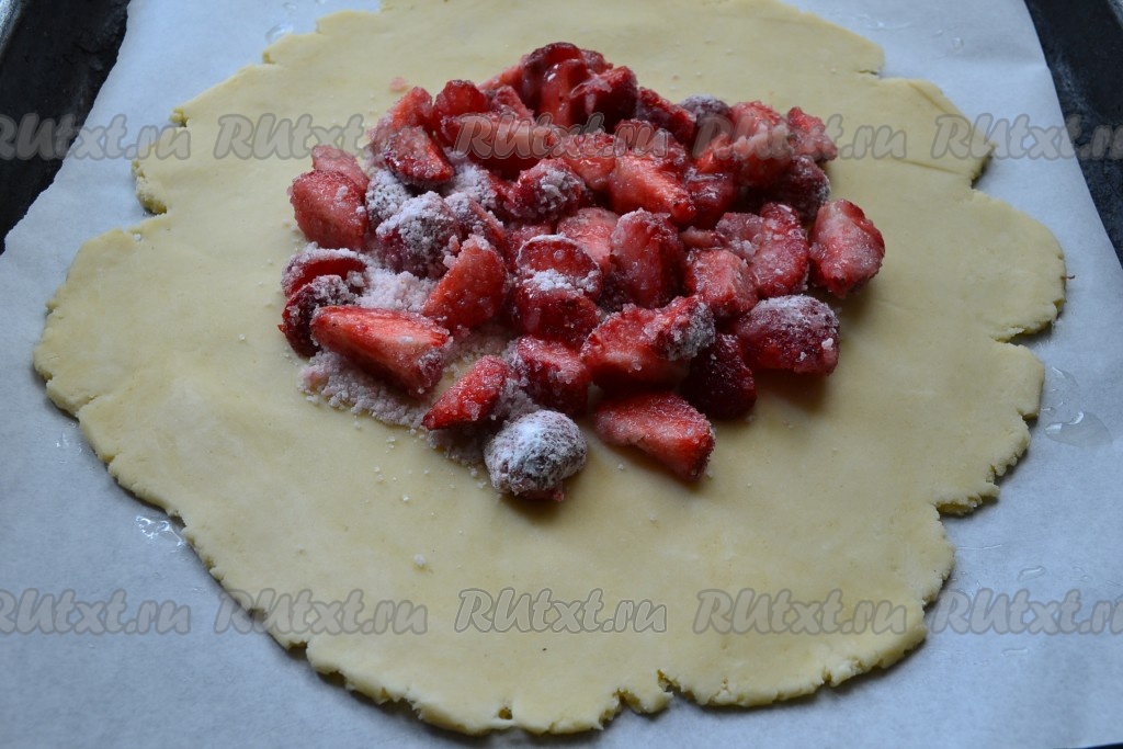 Охладившееся тесто раскатать в лепёшку толщиной около 0,5 сантиметра, выложить её на противень, застеленный пергаментом (если не уверены в качестве пергамента, тогда перед выкладыванием теста смажьте пергамент немного растительным маслом). В середину лепёшки выложить клубнику.
