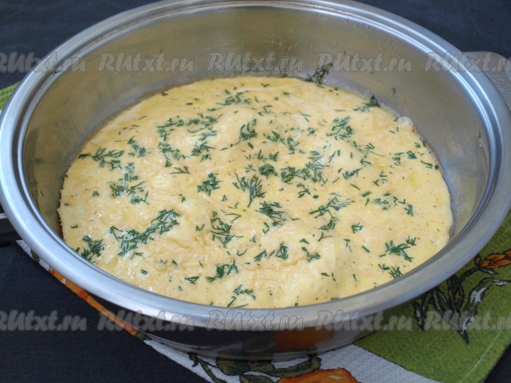 Сковороду накрыть крышкой и готовить омлет на медленном огне 5 минут. Затем огонь выключить и оставить омлет "дойти" ещё на 5 минут.