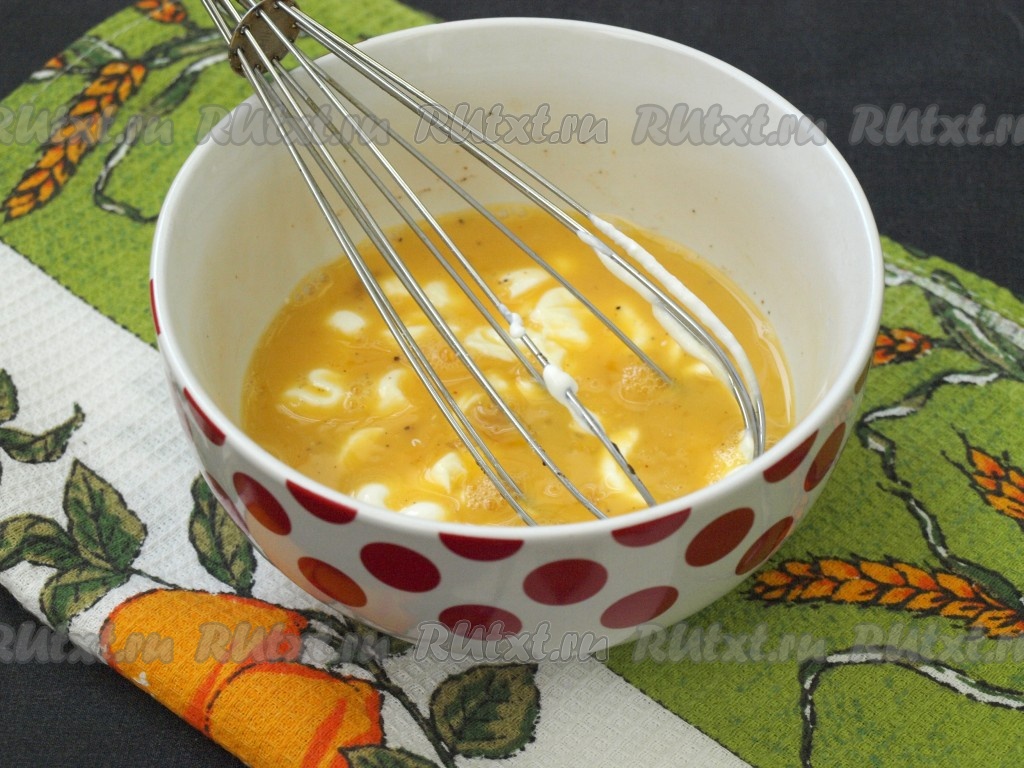 Взбить яйца венчиком, добавить сметану и затем снова размешать.