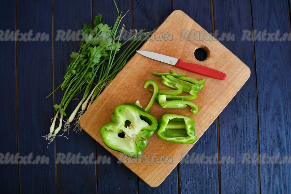 Из перца удалить семена и плодоножку. Нарезать перец соломкой или мелкими кубиками.