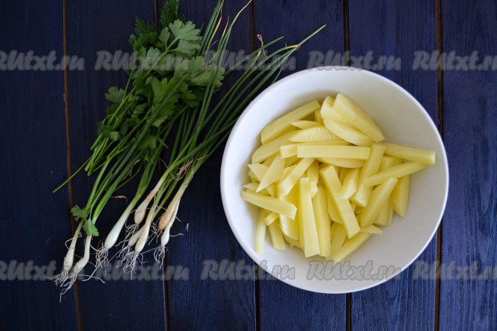 В кастрюлю налить воду и довести до кипения. Очистить картофель, нарезать соломкой или кубиками, выложить в кипящую воду и варить на небольшом огне до готовности (минут 15-20).