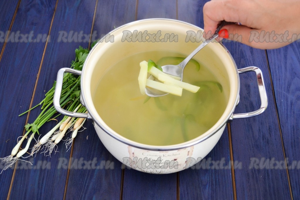 По истечении времени всыпать в суп мелко нарезанные зеленый лук и петрушку, снять с огня и оставить еще на 5-10 минут, чтобы супчик настоялся.