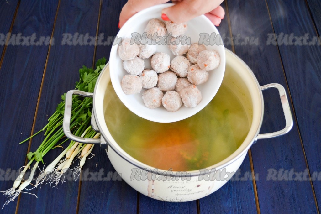 Через 2-3 минуты после добавления фрикаделек, выложить в кастрюлю обжаренные овощи, варить суп на небольшом огне еще 10 минут.