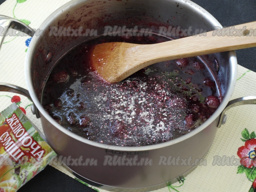 Далее засыпать желирующую смесь и варить 10 минут на среднем огне, снимая образующуюся на поверхности пену.