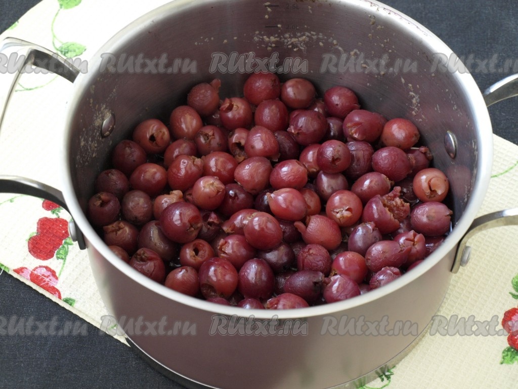 Черешню пересыпать в кастрюлю, добавить воду и поставить на средний огонь. Варить 5 минут под крышкой.