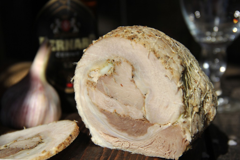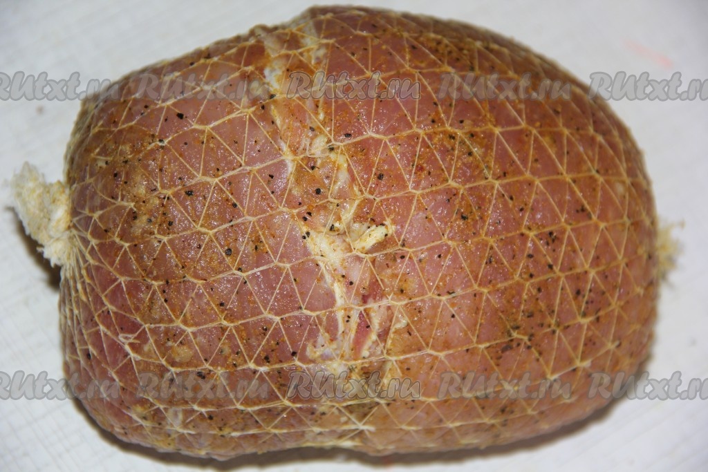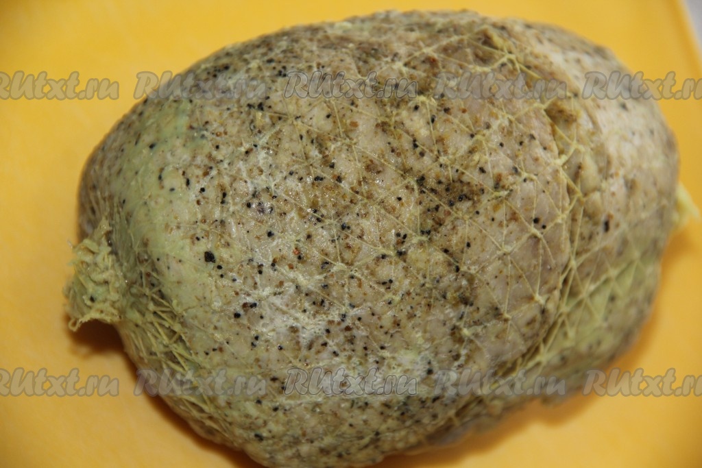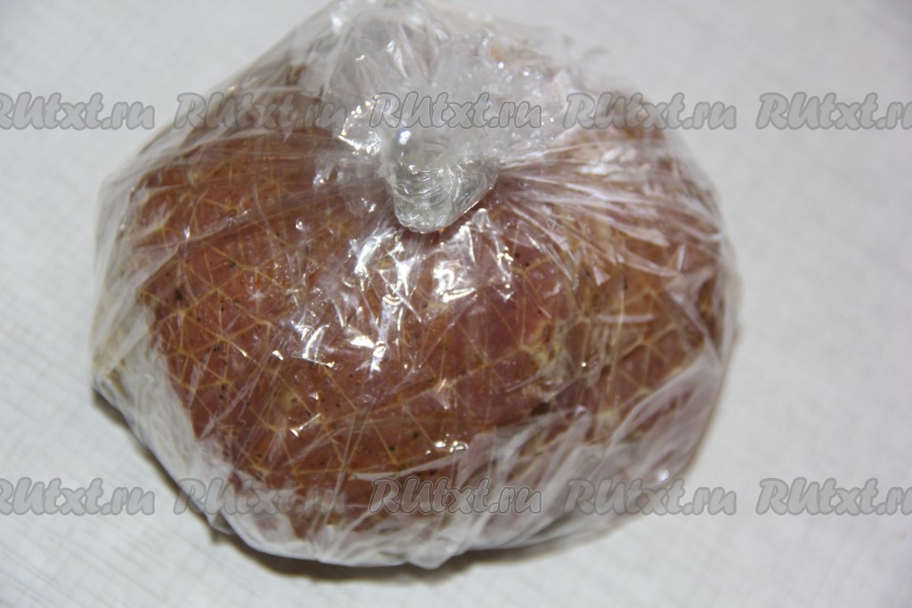 Замаринованное мясо свернуть в плотный рулет, поместить в эластичный трубчатый бинт № 3 и завязать бинт с двух сторон. Такой бинт можно купить в любой аптеке, стоит он в пределах 10 рублей, перед использование бинт хорошо промыть под проточной водой и высушить.