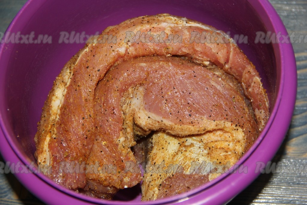 Хорошо втереть специи в мясо. Оставить свинину мариноваться на 5-8 часов (можно на ночь). Я убрала мясо в холодильник.