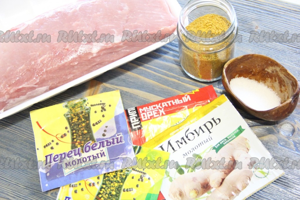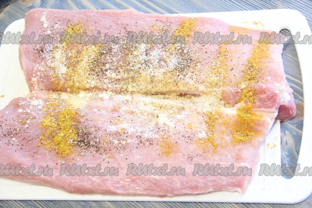 Подготовить мясо (я разрезала свиную шею на две части вдоль), промыть и обсушить. Присыпать свинину солью, имбирем, мускатным орехом, смесью перцев и универсальной приправой для мяса.
